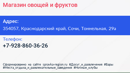 Магазин овощей и фруктов по адресу 354057, Краснодарский край, Сочи, Тоннельная, 29а в дальнейшем Организация, размещена в следующих категориях: