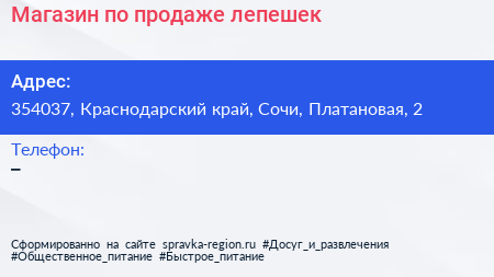 Магазин по продаже лепешек по адресу 354037, Краснодарский край, Сочи, Платановая, 2 в дальнейшем Организация, размещена в следующих категориях: