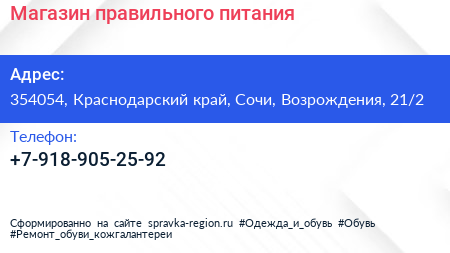 Магазин правильного питания по адресу 354054, Краснодарский край, Сочи, Возрождения, 21/2 в дальнейшем Организация, размещена в следующих категориях: