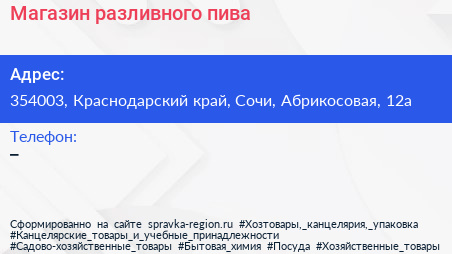 Магазин разливного пива по адресу 354003, Краснодарский край, Сочи, Абрикосовая, 12а в дальнейшем Организация, размещена в следующих категориях: