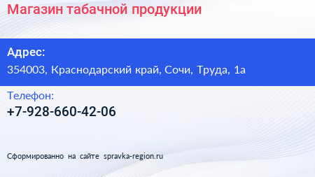 Магазин табачной продукции по адресу 354003, Краснодарский край, Сочи, Труда, 1а в дальнейшем Организация, размещена в следующих категориях: