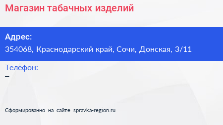 Магазин табачных изделий по адресу 354068, Краснодарский край, Сочи, Донская, 3/11 в дальнейшем Организация, размещена в следующих категориях: