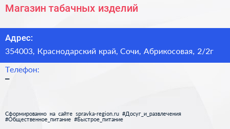 Магазин табачных изделий по адресу 354003, Краснодарский край, Сочи, Абрикосовая, 2/2г в дальнейшем Организация, размещена в следующих категориях: