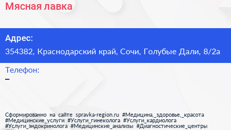 Мясная лавка по адресу 354382, Краснодарский край, Сочи, Голубые Дали, 8/2а в дальнейшем Организация, размещена в следующих категориях:
