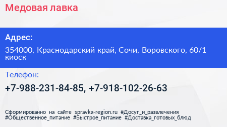 Медовая лавка по адресу 354000, Краснодарский край, Сочи, Воровского, 60/1 киоск в дальнейшем Организация, размещена в следующих категориях: