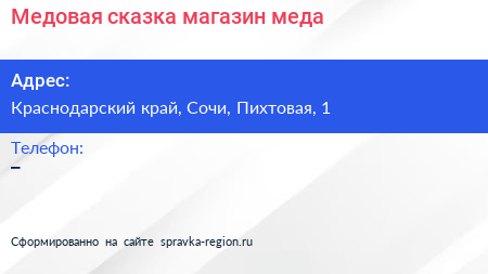 Медовая сказка, магазин меда по адресу Краснодарский край, Сочи, Пихтовая, 1 в дальнейшем Организация, размещена в следующих категориях: