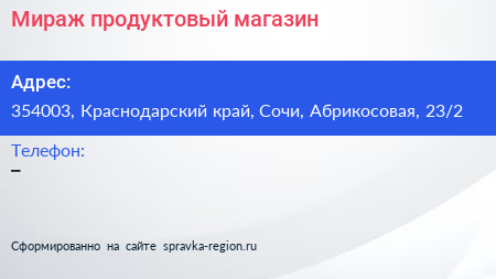 Мираж, продуктовый магазин по адресу 354003, Краснодарский край, Сочи, Абрикосовая, 23/2 в дальнейшем Организация, размещена в следующих категориях: