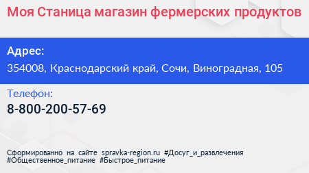 Моя Станица, магазин фермерских продуктов по адресу 354008, Краснодарский край, Сочи, Виноградная, 105 в дальнейшем Организация, размещена в следующих категориях: