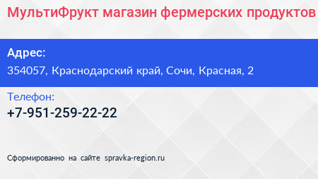 МультиФрукт, магазин фермерских продуктов по адресу 354057, Краснодарский край, Сочи, Красная, 2 в дальнейшем Организация, размещена в следующих категориях: