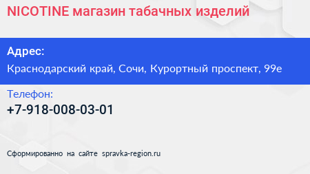 NICOTINE, магазин табачных изделий по адресу Краснодарский край, Сочи, Курортный проспект, 99е в дальнейшем Организация, размещена в следующих категориях: