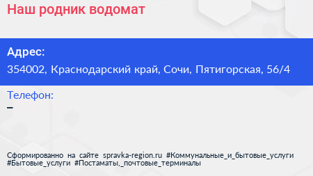 Наш родник, водомат по адресу 354002, Краснодарский край, Сочи, Пятигорская, 56/4 в дальнейшем Организация, размещена в следующих категориях: