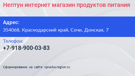Нептун, интернет-магазин продуктов питания по адресу 354068, Краснодарский край, Сочи, Донская, 7 в дальнейшем Организация, размещена в следующих категориях: