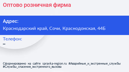 Оптово-розничная фирма по адресу Краснодарский край, Сочи, Краснодонская, 44Б в дальнейшем Организация, размещена в следующих категориях: