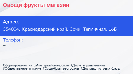 Овощи & фрукты, магазин по адресу 354004, Краснодарский край, Сочи, Тепличная, 16Б в дальнейшем Организация, размещена в следующих категориях: