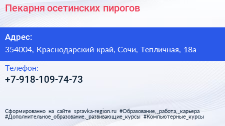 Пекарня осетинских пирогов по адресу 354004, Краснодарский край, Сочи, Тепличная, 18а в дальнейшем Организация, размещена в следующих категориях:
