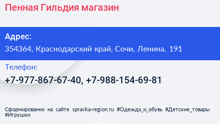Пенная Гильдия, магазин по адресу 354364, Краснодарский край, Сочи, Ленина, 191 в дальнейшем Организация, размещена в следующих категориях: