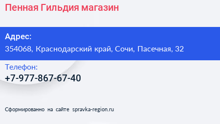 Пенная Гильдия, магазин по адресу 354068, Краснодарский край, Сочи, Пасечная, 32 в дальнейшем Организация, размещена в следующих категориях: