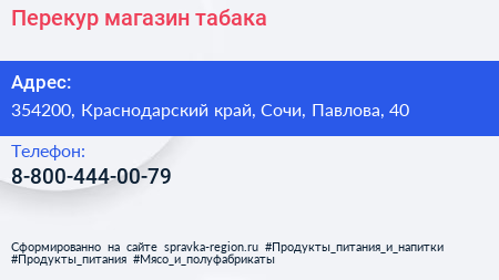 Перекур, магазин табака по адресу 354200, Краснодарский край, Сочи, Павлова, 40 в дальнейшем Организация, размещена в следующих категориях: