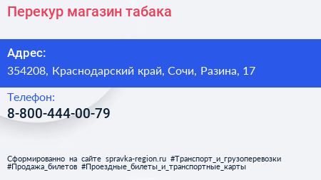 Перекур, магазин табака по адресу 354208, Краснодарский край, Сочи, Разина, 17 в дальнейшем Организация, размещена в следующих категориях: