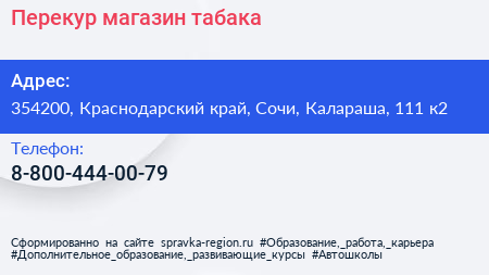 Перекур, магазин табака по адресу 354200, Краснодарский край, Сочи, Калараша, 111 к2 в дальнейшем Организация, размещена в следующих категориях: