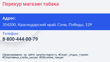 Перекур, магазин табака по адресу 354200, Краснодарский край, Сочи, Победы, 129 в дальнейшем Организация, размещена в следующих категориях: