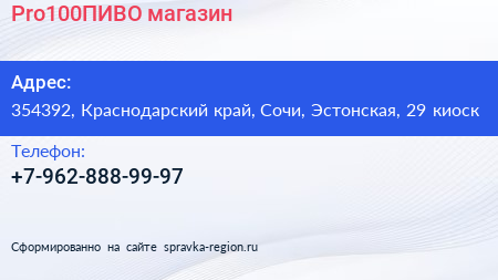 Pro100ПИВО, магазин по адресу 354392, Краснодарский край, Сочи, Эстонская, 29 киоск в дальнейшем Организация, размещена в следующих категориях: