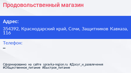 Продовольственный магазин по адресу 354392, Краснодарский край, Сочи, Защитников Кавказа, 116 в дальнейшем Организация, размещена в следующих категориях: