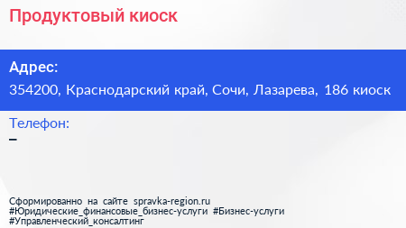 Продуктовый киоск по адресу 354200, Краснодарский край, Сочи, Лазарева, 186 киоск в дальнейшем Организация, размещена в следующих категориях:
