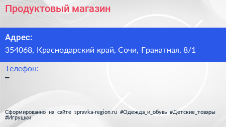 Продуктовый магазин по адресу 354068, Краснодарский край, Сочи, Гранатная, 8/1 в дальнейшем Организация, размещена в следующих категориях: