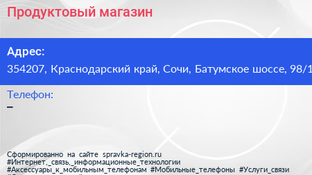 Продуктовый магазин по адресу 354207, Краснодарский край, Сочи, Батумское шоссе, 98/1 в дальнейшем Организация, размещена в следующих категориях:
