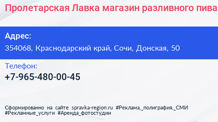 Пролетарская Лавка, магазин разливного пива по адресу 354068, Краснодарский край, Сочи, Донская, 50 в дальнейшем Организация, размещена в следующих категориях: