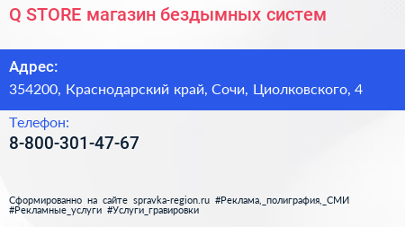 Q STORE, магазин бездымных систем по адресу 354200, Краснодарский край, Сочи, Циолковского, 4 в дальнейшем Организация, размещена в следующих категориях: