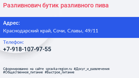 Разливнович, бутик разливного пива по адресу Краснодарский край, Сочи, Славы, 49/11 в дальнейшем Организация, размещена в следующих категориях: