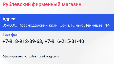 Рублевский, фирменный магазин по адресу 354000, Краснодарский край, Сочи, Юных Ленинцев, 14 в дальнейшем Организация, размещена в следующих категориях:
