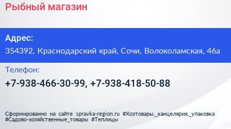 Рыбный магазин по адресу 354392, Краснодарский край, Сочи, Волоколамская, 46а в дальнейшем Организация, размещена в следующих категориях: