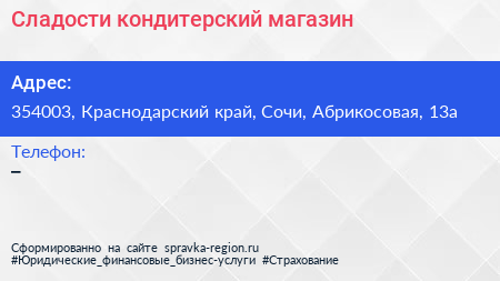 Сладости, кондитерский магазин по адресу 354003, Краснодарский край, Сочи, Абрикосовая, 13а в дальнейшем Организация, размещена в следующих категориях: