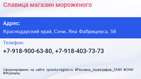 Славица, магазин мороженого по адресу Краснодарский край, Сочи, Яна Фабрициуса, 58 в дальнейшем Организация, размещена в следующих категориях: