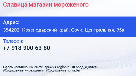 Славица, магазин мороженого по адресу 354202, Краснодарский край, Сочи, Центральная, 95а в дальнейшем Организация, размещена в следующих категориях: