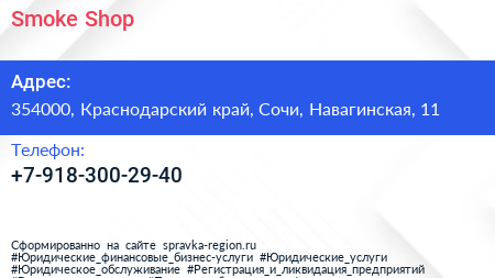 Smoke Shop по адресу 354000, Краснодарский край, Сочи, Навагинская, 11 в дальнейшем Организация, размещена в следующих категориях:
