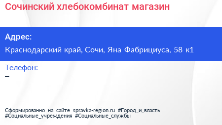 Сочинский хлебокомбинат, магазин по адресу Краснодарский край, Сочи, Яна Фабрициуса, 58 к1 в дальнейшем Организация, размещена в следующих категориях: