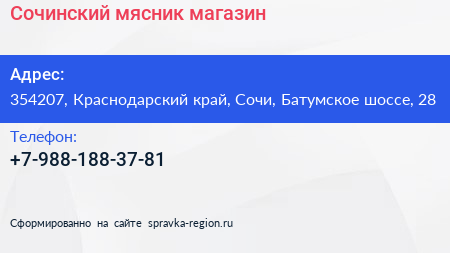 Сочинский мясник, магазин по адресу 354207, Краснодарский край, Сочи, Батумское шоссе, 28 в дальнейшем Организация, размещена в следующих категориях: