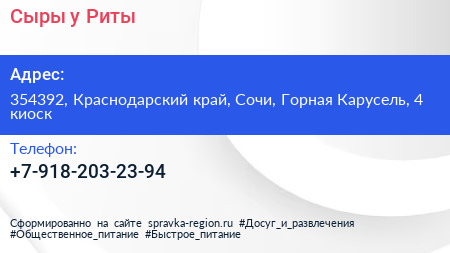 Сыры у Риты по адресу 354392, Краснодарский край, Сочи, Горная Карусель, 4 киоск в дальнейшем Организация, размещена в следующих категориях: