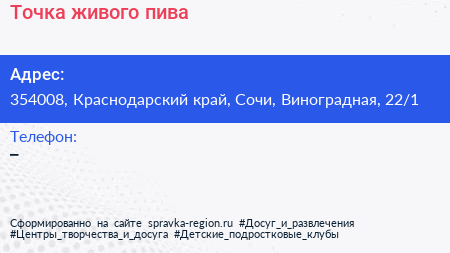 Точка живого пива по адресу 354008, Краснодарский край, Сочи, Виноградная, 22/1 в дальнейшем Организация, размещена в следующих категориях: