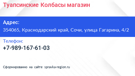 Туапсинские Колбасы, магазин по адресу 354065, Краснодарский край, Сочи, улица Гагарина, 4/2 в дальнейшем Организация, размещена в следующих категориях: