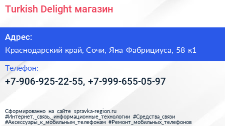 Turkish Delight, магазин по адресу Краснодарский край, Сочи, Яна Фабрициуса, 58 к1 в дальнейшем Организация, размещена в следующих категориях: