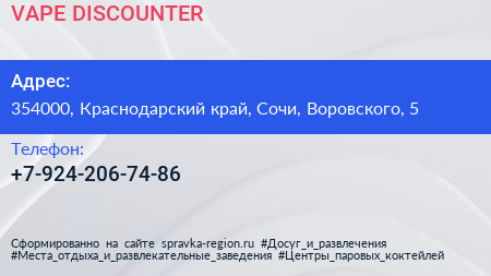 VAPE DISCOUNTER по адресу 354000, Краснодарский край, Сочи, Воровского, 5 в дальнейшем Организация, размещена в следующих категориях: