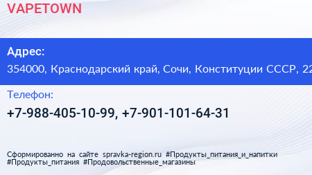 VAPETOWN по адресу 354000, Краснодарский край, Сочи, Конституции СССР, 22 в дальнейшем Организация, размещена в следующих категориях: