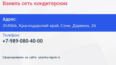 Ваниль, сеть кондитерских по адресу 354066, Краснодарский край, Сочи, Дарвина, 26 в дальнейшем Организация, размещена в следующих категориях: