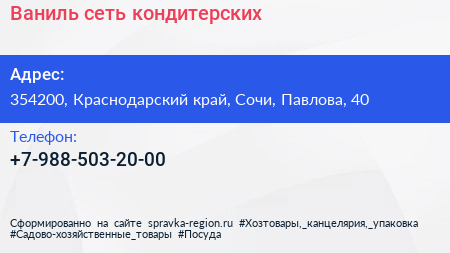 Ваниль, сеть кондитерских по адресу 354200, Краснодарский край, Сочи, Павлова, 40 в дальнейшем Организация, размещена в следующих категориях: