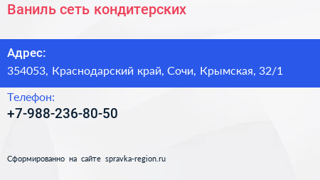 Ваниль, сеть кондитерских по адресу 354053, Краснодарский край, Сочи, Крымская, 32/1 в дальнейшем Организация, размещена в следующих категориях: